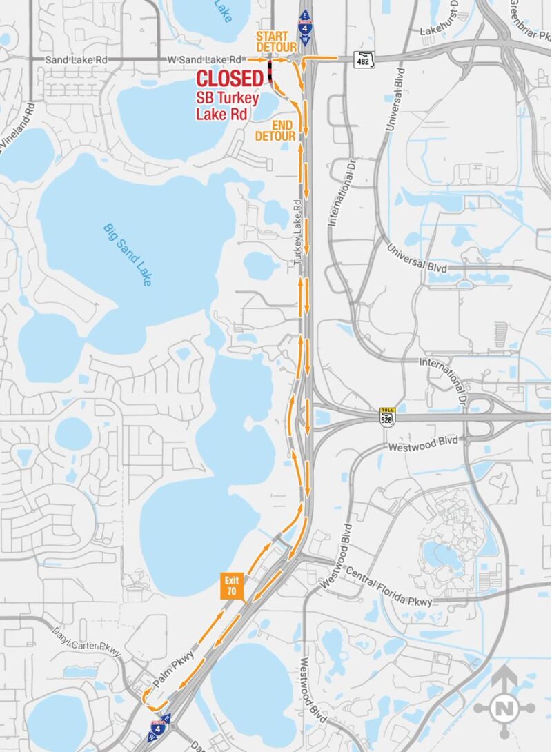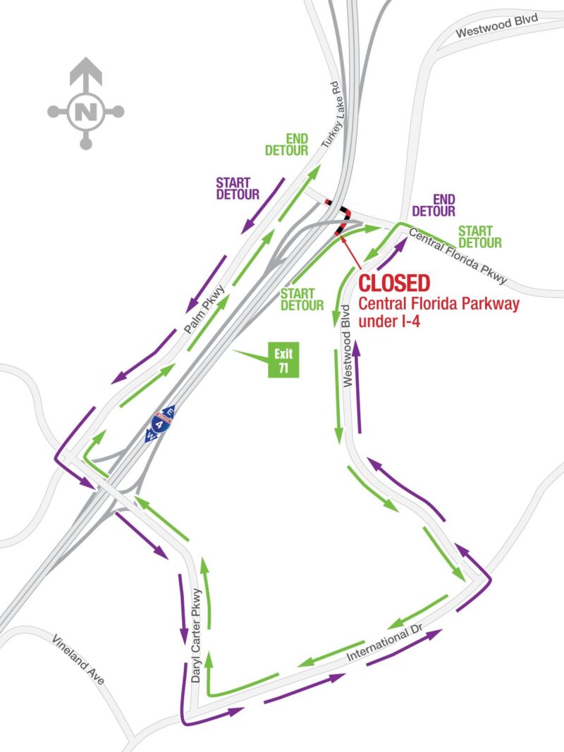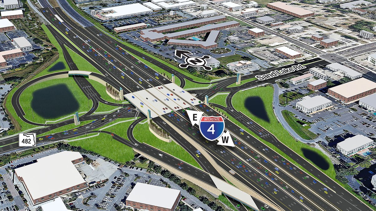 - Introduction of a new construction-phase diverging diamond interchange (DDI) at Sand Lake Road (State Road (S.R.) 482) in March 2024. Implementing this DDI gives crews space to work in the median of Sand Lake Road. Crews need that room to complete overhead bridge work, reconstruct the I-4 general use lanes, and extend I-4 Express from near Kirkman Road over Sand Lake Road. The express lanes will transition to a single, westbound, buffer-separated express lane from west of Sand Lake Road and tie in just west of Central Florida Parkway. The I-4 and Sand Lake Road interchange will continue to undergo improvements until anticipated completion in 2027.