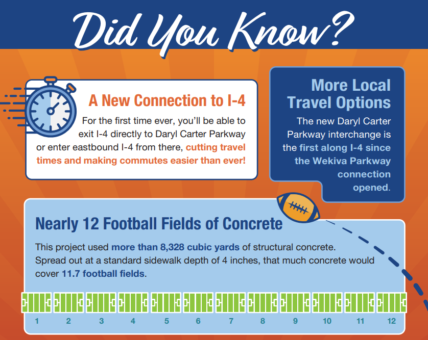 The Daryl Carter Parkway overpass was converted into a DDI in July 2025. This project transformed the existing I-4 overpass into an interchange with three new ramps. Drivers on both eastbound and westbound I-4 now have access to Daryl Carter Parkway from two new exit ramps, and motorists can also access eastbound I-4 right from Daryl Carter Parkway. FDOT completed this project in September 2025.