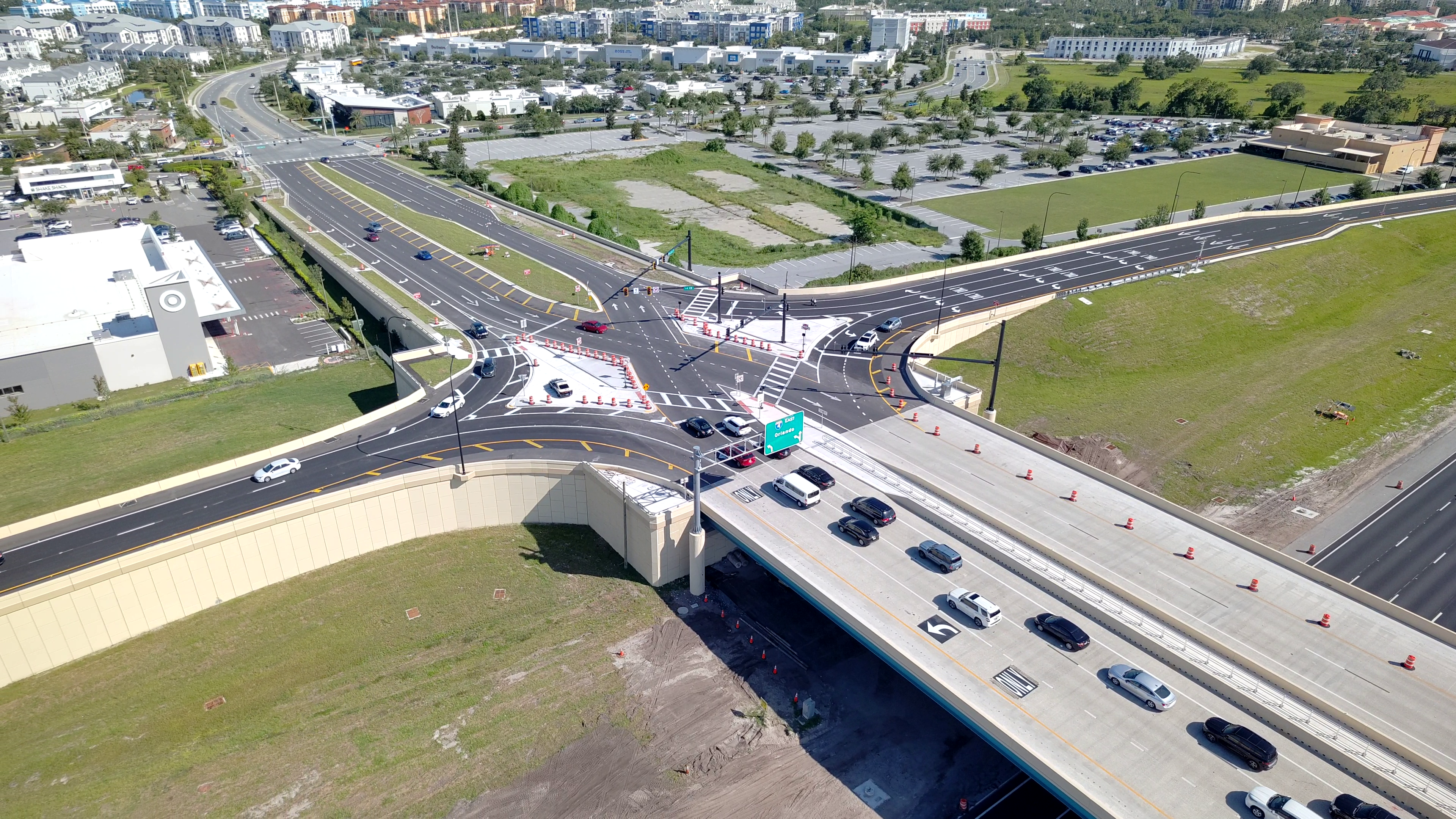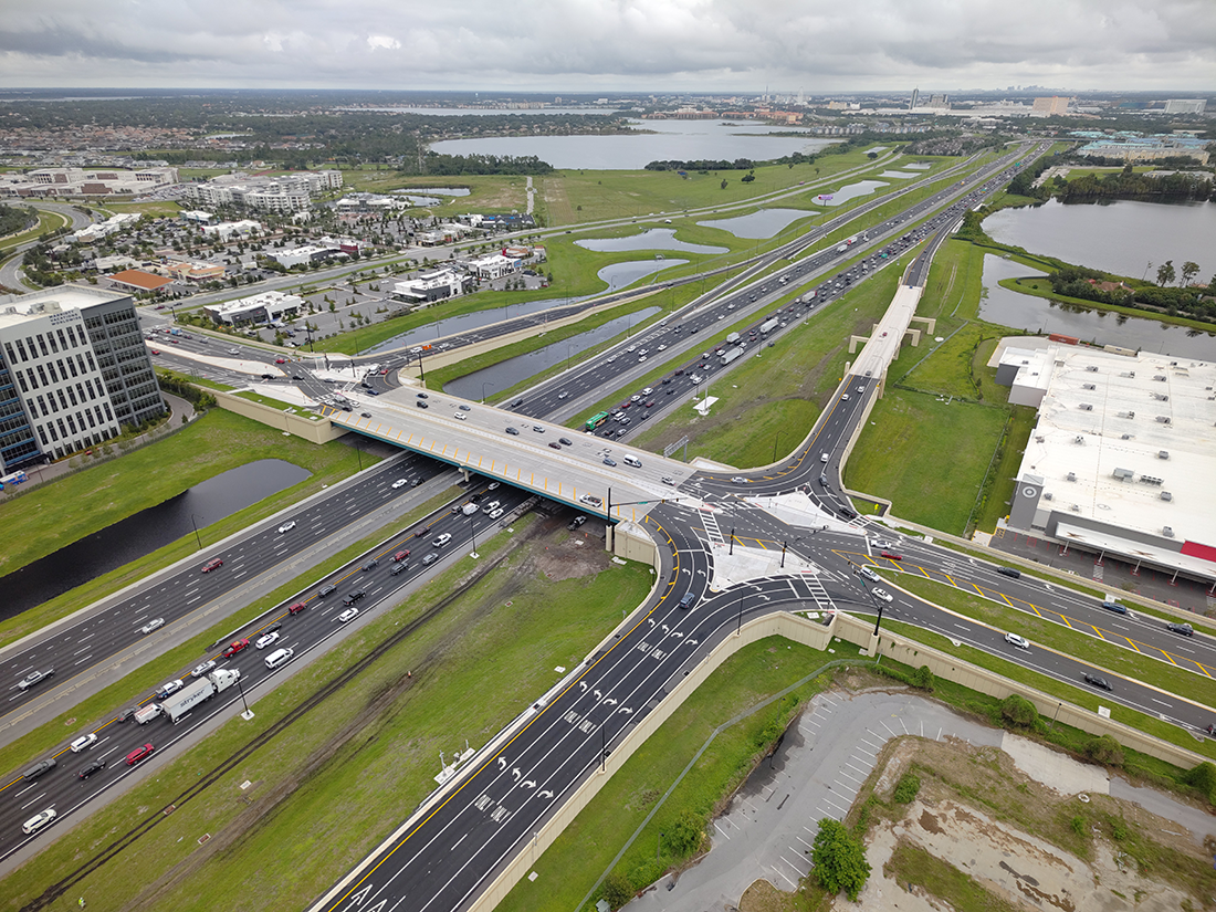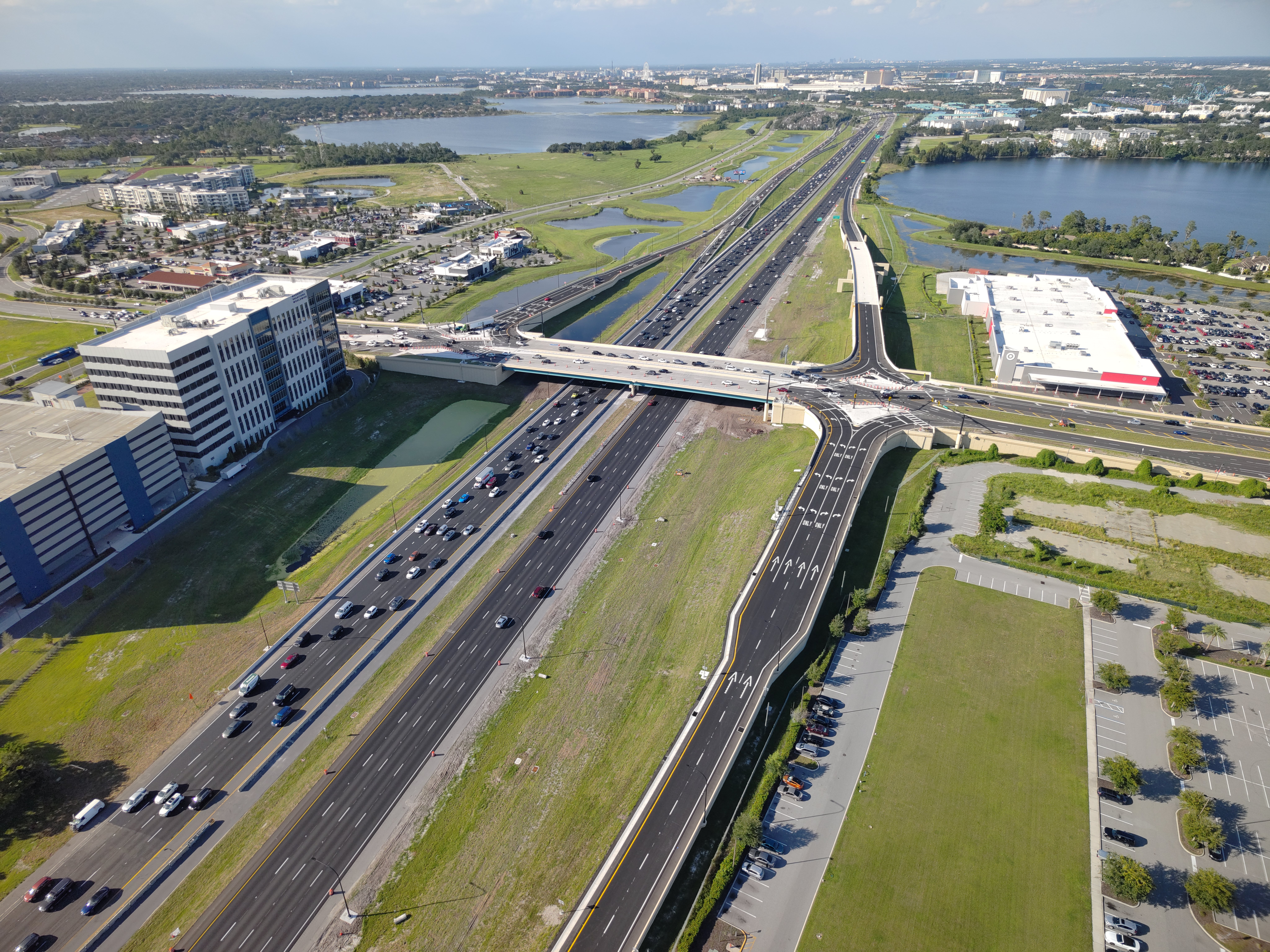 The project also converted the existing Daryl Carter Parkway overpass to a diverging diamond interchange (DDI) — a milestone for safety, traffic flow, and connectivity in Orlando’s busy tourism corridor. The innovative DDI design briefly moves traffic on Daryl Carter Parkway to the left side of the roadway at a traffic signal, then back to the right side at a second signal, eliminating left turns across oncoming traffic. The new interchange also has enhanced pedestrian safety features, including new bicycle lanes, sidewalks protected by concrete barriers, and crosswalks.