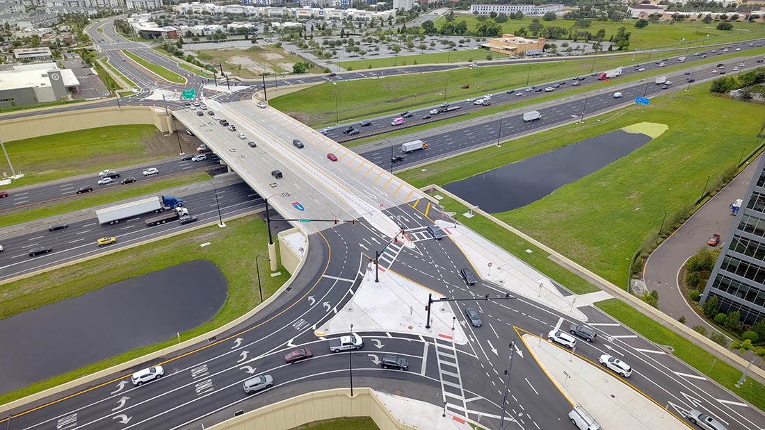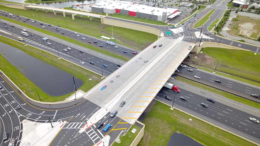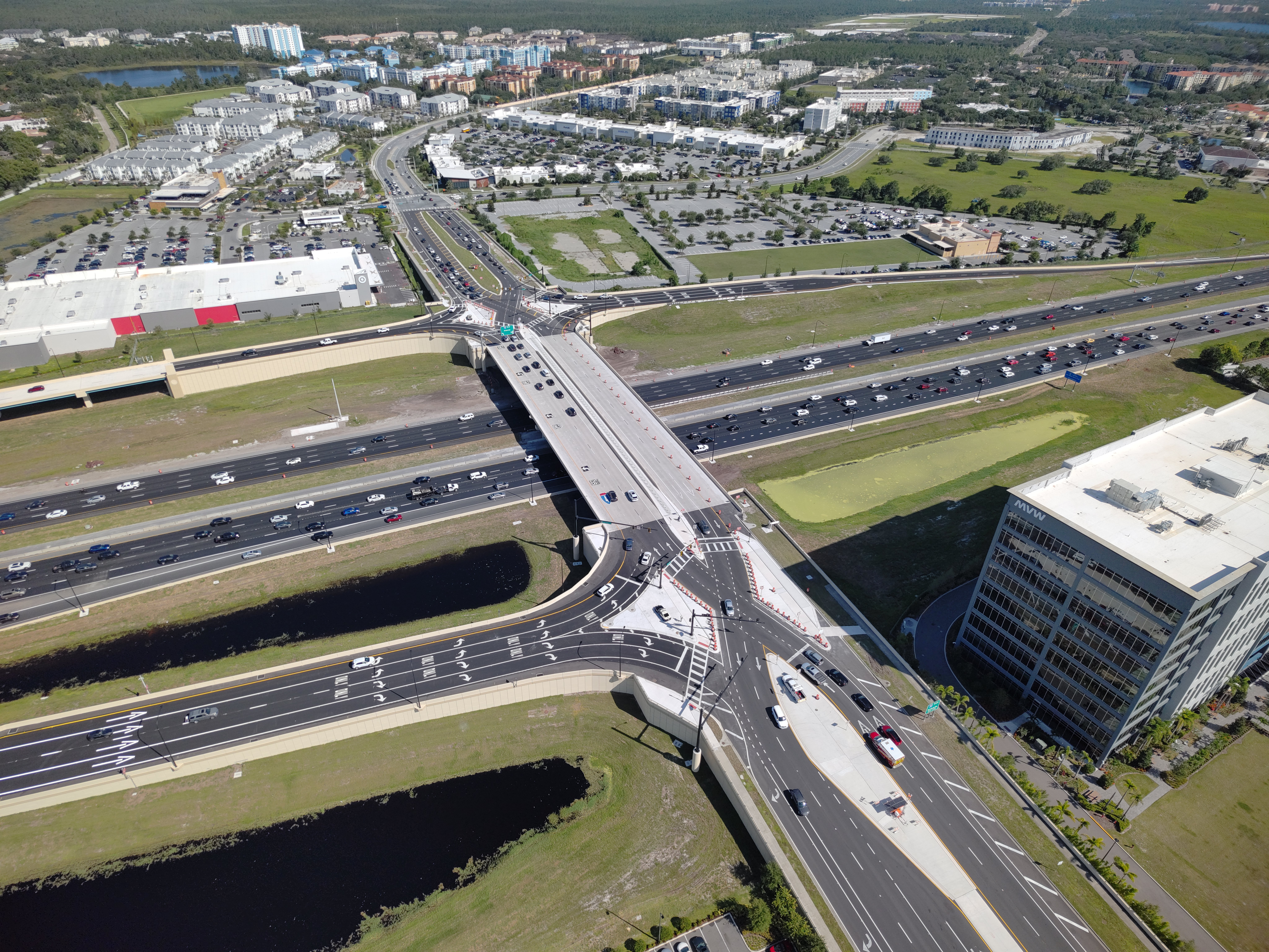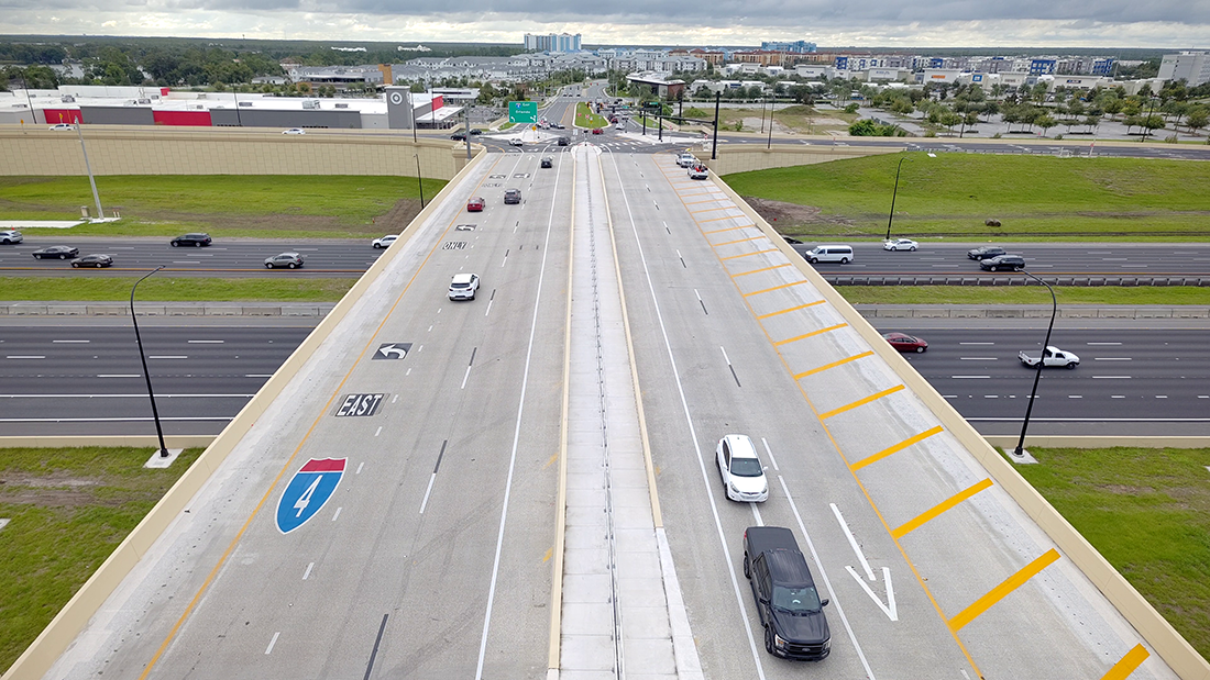 The project also converted the existing Daryl Carter Parkway overpass to a diverging diamond interchange (DDI) — a milestone for safety, traffic flow, and connectivity in Orlando’s busy tourism corridor. The innovative DDI design briefly moves traffic on Daryl Carter Parkway to the left side of the roadway at a traffic signal, then back to the right side at a second signal, eliminating left turns across oncoming traffic. The new interchange also has enhanced pedestrian safety features, including new bicycle lanes, sidewalks protected by concrete barriers, and crosswalks.